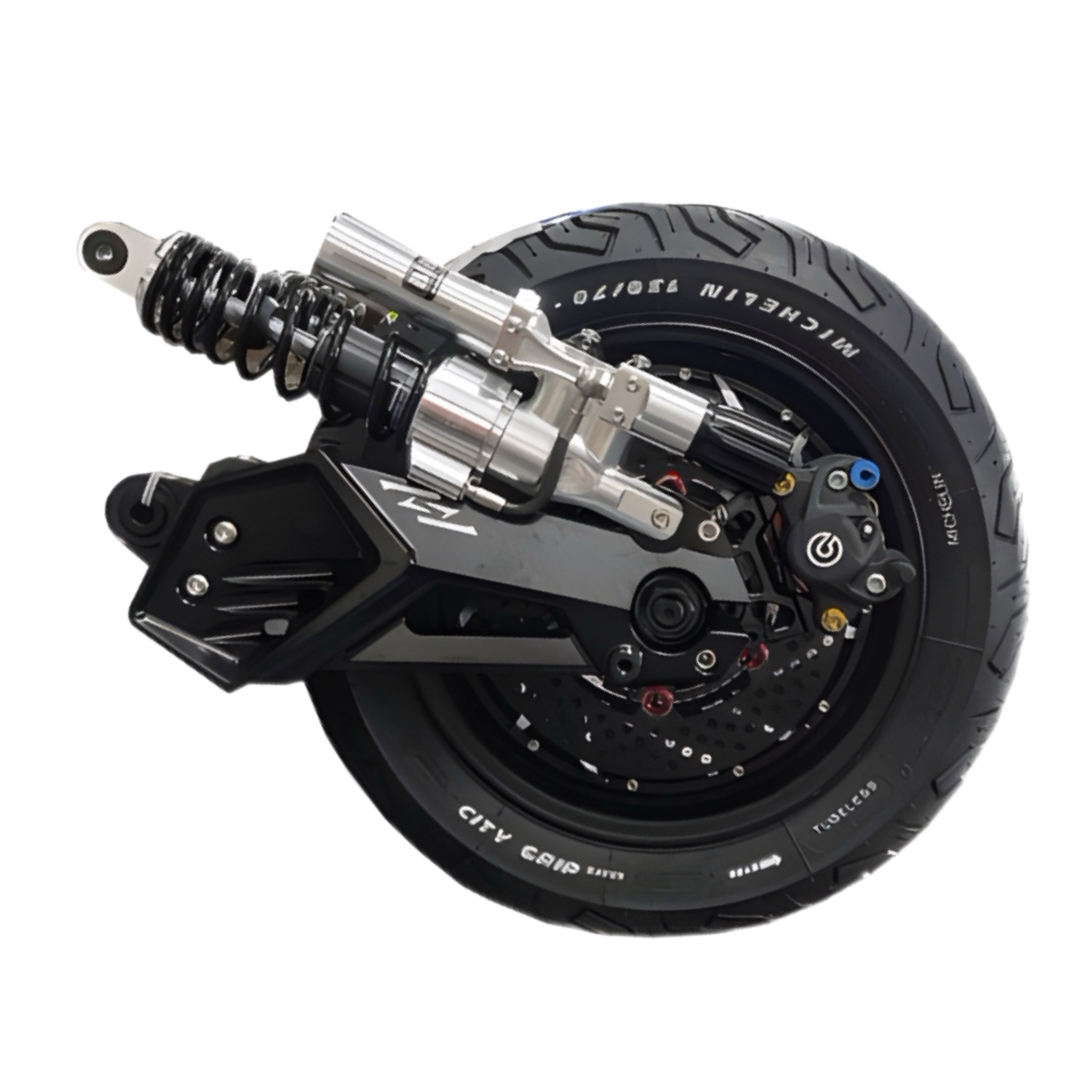 The upgraded motor uses a larger axle, so the original rear swing arm cannot be reused. This reinforced rear arm accommodates the larger motor housing and includes a new brake mounting system. Because the original brake system is incompatible, the kit includes a larger brake disc and upgraded caliper for improved braking performance and safety.
